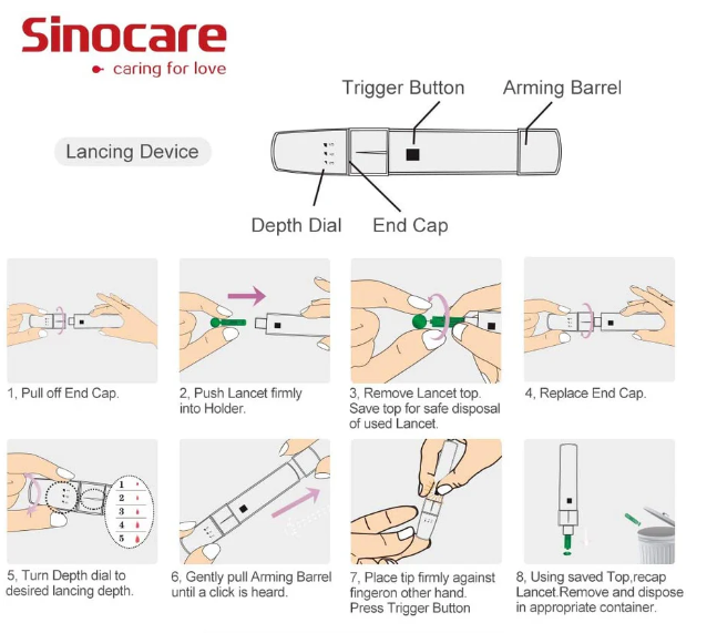 - Kit de test de glycémie : Ce kit couvre le moniteur de glycémie Sinocare Safe AQ Voice, les bandelettes et les lancettes, l’autopiqueur sans douleur, l’étui et le manuel d’utilisation. Un ensemble de matériel est fourni pour répondre à tous vos besoins en matière de mesure de la glycémie.